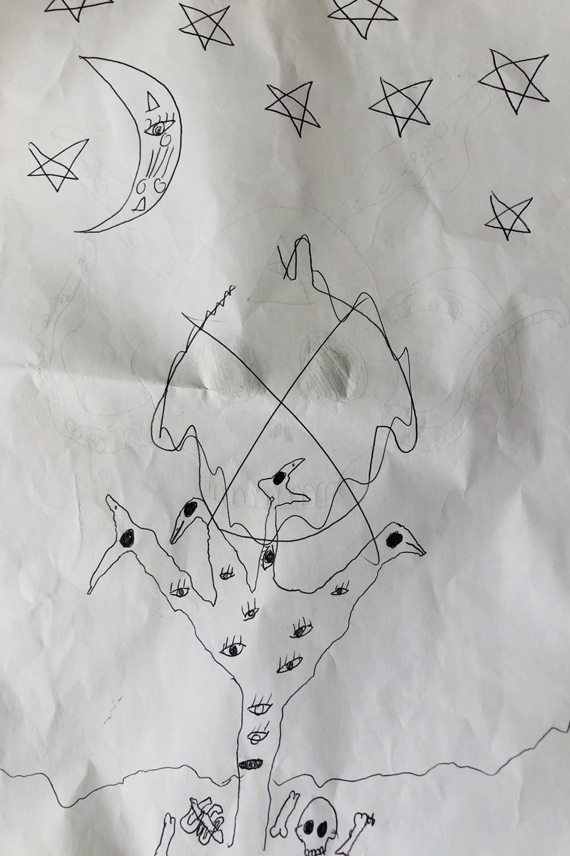 My 8yr olds ‘doodles’ over the weekend. Pretty sure this is what they usually find in kids rooms at the start of horror films before the spooky shit goes off and folk start getting dismembered. #darkart #weirdweanpic.twitter.com/eRugc6YZIp