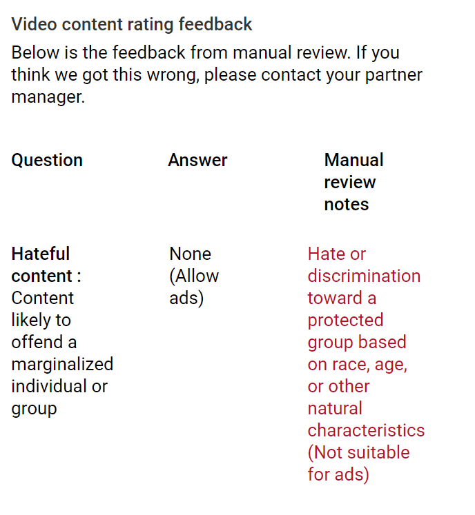 Um, @YouTube and/or @TeamYouTube why in the hell does this say I was being hateful to a protected group? Please tell me where in this video either of us said anything that would fit that: https://youtu.be/B9QewLFmub0 pic.twitter.com/JTL0eVnxjM