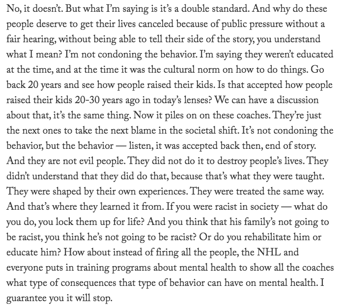 Does the NHL need to implement a concrete education and rehabilitation program to deal with (and hopefully prevent) future abuse, as well as a much better reporting system that actually protects players from retaliation? Absolutely. But YOU STILL NEED CONSEQUENCES IN THE MOMENT