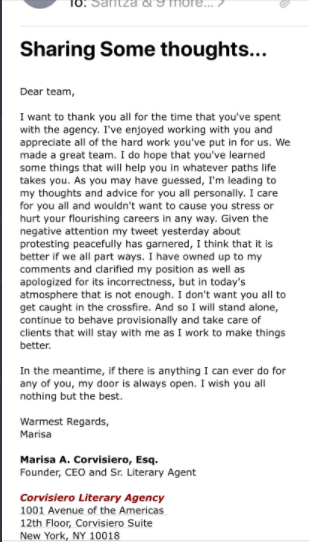 Marisa Corvisiero of Corvisiero Literary Agency is letting her entire staff go, after yesterday's controversy over one of her tweets prompted resignations. pic.twitter.com/ePzY5YPilT