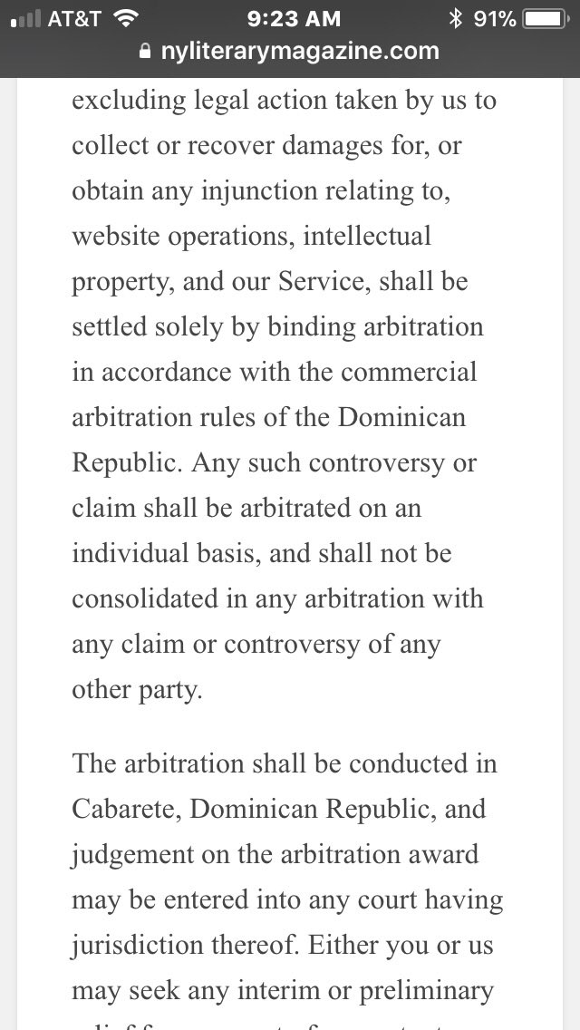 @fozmeadows Hey! If you have a dispute with NYLM, it’s arbitrated in the Dominican Republic. Hmmmmm. It’s at the bottom of their arbitration clause on their website.pic.twitter.com/XtmhhvnwjT