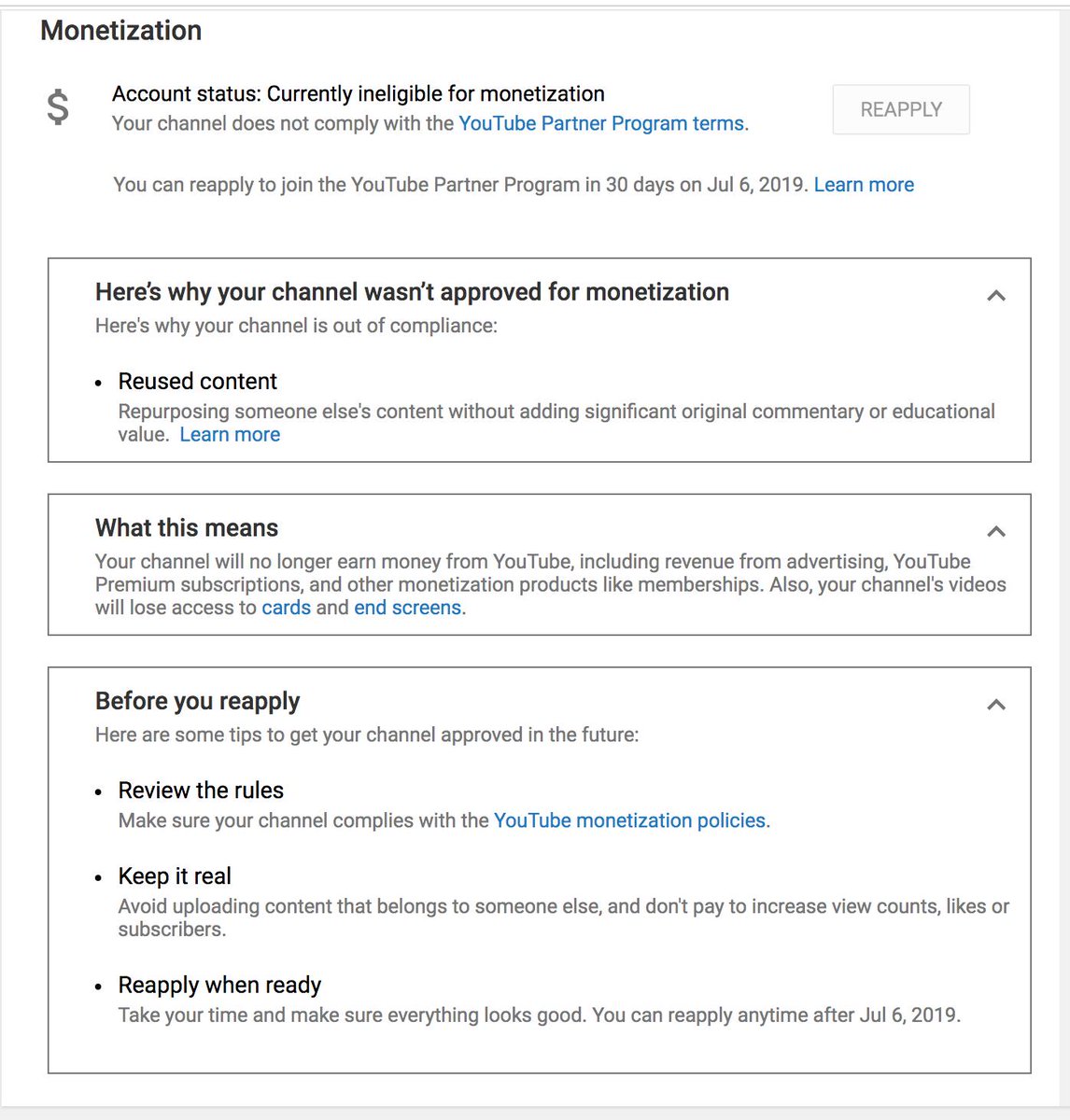 Thanks for the reply. It says reuse My content is Transformative & Unique I never re-upload Never had any strikes since 2008 Spend dozens of hrs editing each vid When my channel gets reviewed its approved. I cant wait till Oct only to get demonetized again in Nov 1yr of On & Offpic.twitter.com/NXvKqmdm0d