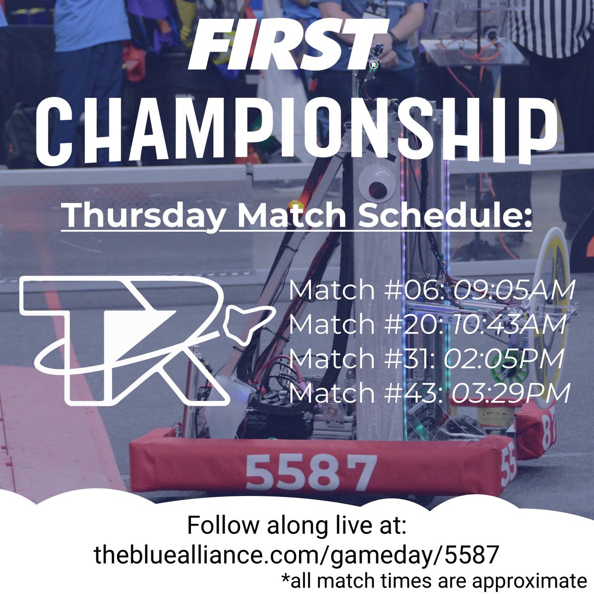 @thebluealliance to track our scores and tune into the live stream! https://www.thebluealliance.com/team/5587 pic.twitter.com/eKB1NKz7U3
