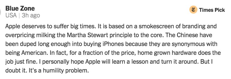 "Apple deserves to suffer big time. It is based on a smokescreen of branding and overpricing milking the Martha Stewart principle to the core," writes a reader in a comment on
