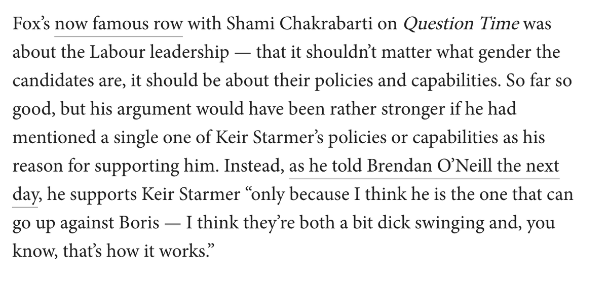 @LozzaFox's argument that political leaders should be chosen on their policies not their gender might have landed better if he hadn't chosen "dick swinging" as the prime attribute he admired about Keir Starmer... https://unherd.com/2020/01/cultural-heroes-please-stay-out-of-politics/ …pic.twitter.com/ZPypTA7rhy
