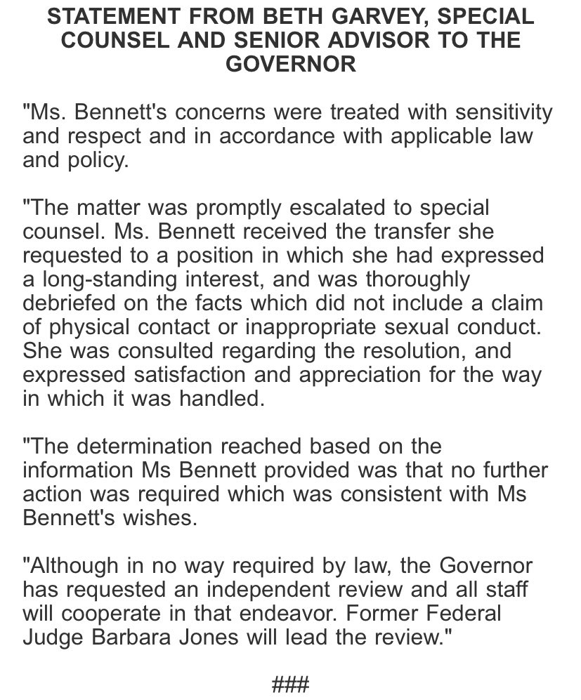 Today, we received a referral letter providing our office the authority to move forward with an independent investigation into allegations of sexual harassment claims made against Governor Cuomo. At the close of the review, the findings will be disclosed in a public report.