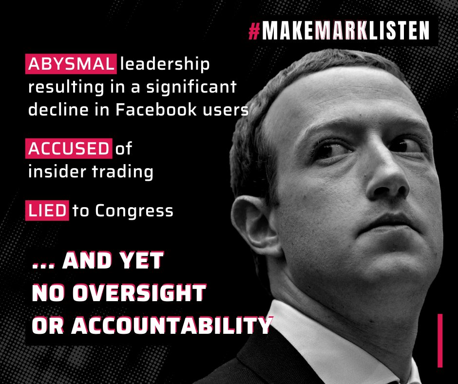 #MarkZuckerberg has led misled advertisers, been accused of insider trading and lied to Congress.@Meta’s corporate governance policies desperately need reforms to ensure accountability and oversight.#MakeMarkListen now.pic.twitter.com/NZQIVIhX35