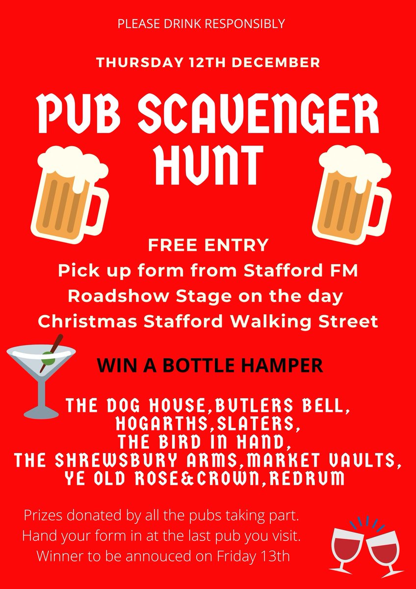 Not only do we have some excellent mobile bars at the Christmas Stafford Walking St we have a pub scavenger hunt. Free entry, pick up clues from the Stafford FM Roadshow Stage on the day.There is no time restrictions. Hand your completed form at the last pub you visit on the day.pic.twitter.com/F9up3ea7om