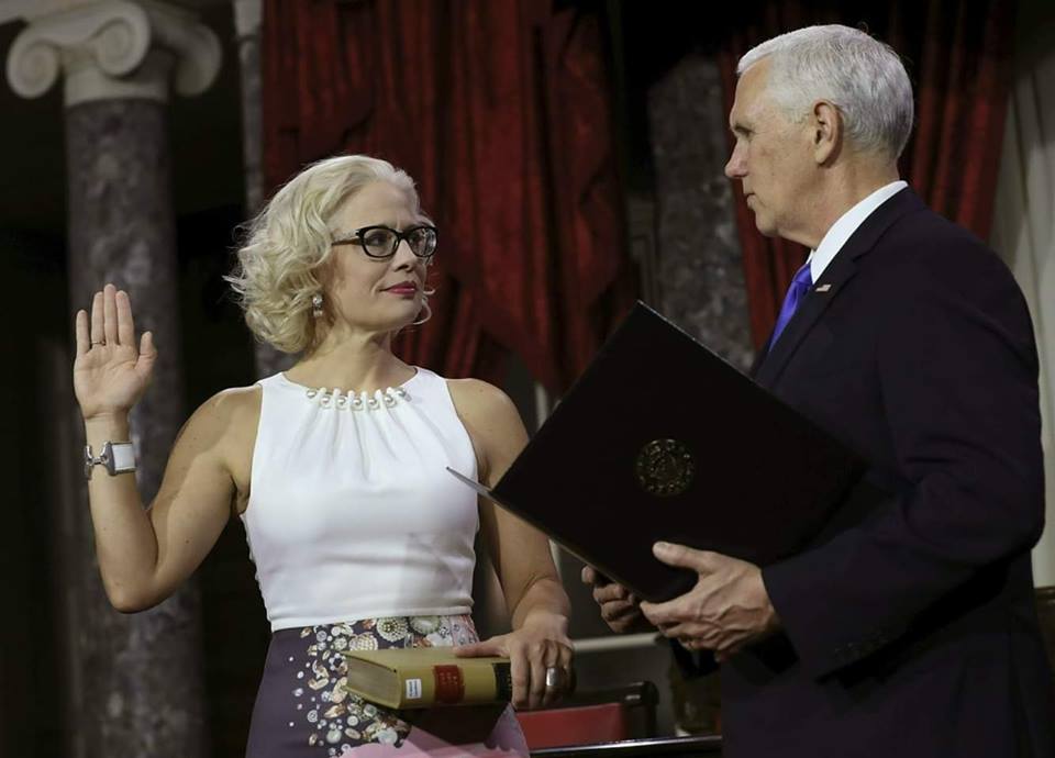 Kyrsten Sinema, the first openly bisexual Senator in U.S. history, has been sworn into office. By anti-queer Pence. While swearing in on a law book instead of a bible. This whole picture is poetic.