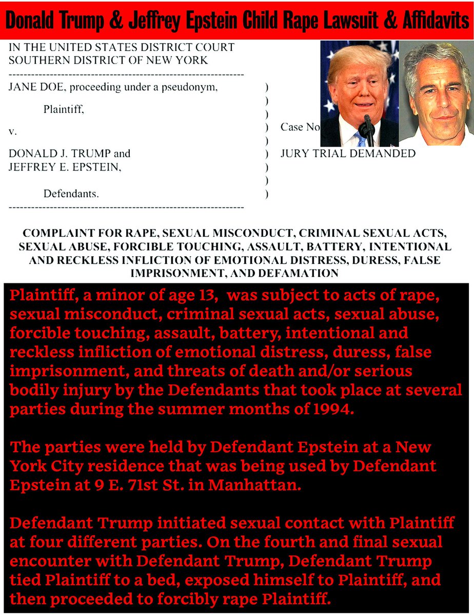 SHARE THIS: Here is the lawsuit against Jeffrey Epstein & Donald J Trump for Child Rape. Lou Dobbs released the victim's name on air. After receiving death threats & fearing for her life she dropped the suit. Nevertheless READ this. It's sickening. http://scribd.com/doc/316341058/Donald-Trump-Jeffrey-Epstein-Rape-Lawsuit-and-Affidavits … … 004pic.twitter.com/nJ2D0KSVKF