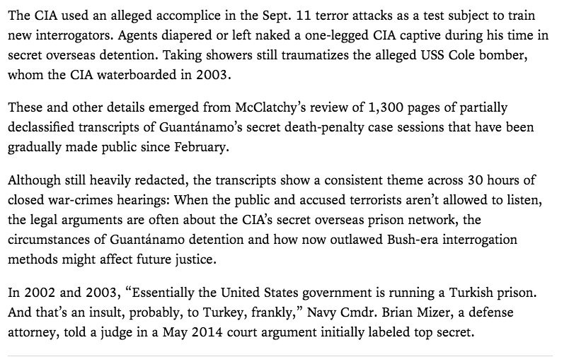 @carolrosenberg pored through 1300 pages of partially declassified transcripts of closed-door hearings at Gitmo and found horrific new details about torture https://www.mcclatchydc.com/news/nation-world/national/national-security/article214381804.html …pic.twitter.com/2b4shbWJV3