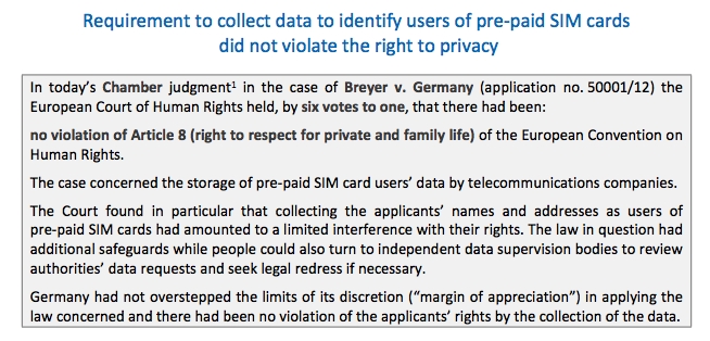 Der Europäische Gerichtshof für Menschenrechte hat heute entschieden, dass die Registrierungspflicht für Prepaid SIM-Karten nicht gegen das Recht auf Privatsphäre verstößt. Wir werden uns in den nächsten Tagen das Urteil noch genauer anschauen.pic.twitter.com/SgcobjJmHZ