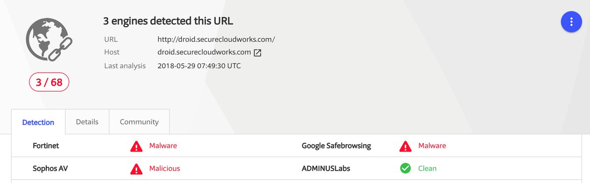 All the data are uploaded to https://droid.securecloudworks.com/api/ which is classified as a #Malware with a score of 3/68 on #VirusTotal