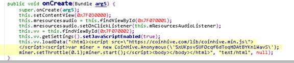 Another sample with a miner service: https://koodous.com/apks/440cc9913d623ed42563e90eec352da9438a9fdac331017af2ab9b87a5eee4af … https://www.virustotal.com/#/file/440cc9913d623ed42563e90eec352da9438a9fdac331017af2ab9b87a5eee4af …pic.twitter.com/W9L8OC8UJh