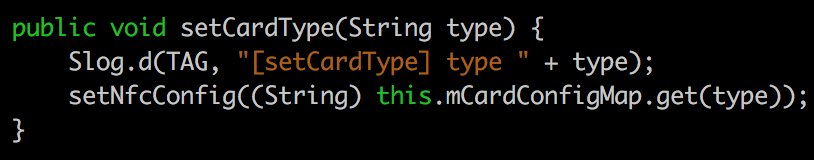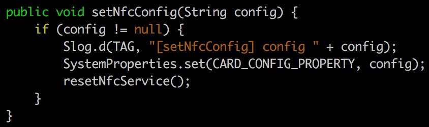 When the method setCardType is called it will use this value and called setNfcConfig. setNfcConfig is setting the CARD_CONFIG_PROPERTY, persist.oem.nfc.rf.card, with this value and reset the NfcService.pic.twitter.com/eQLNQ5pJDI