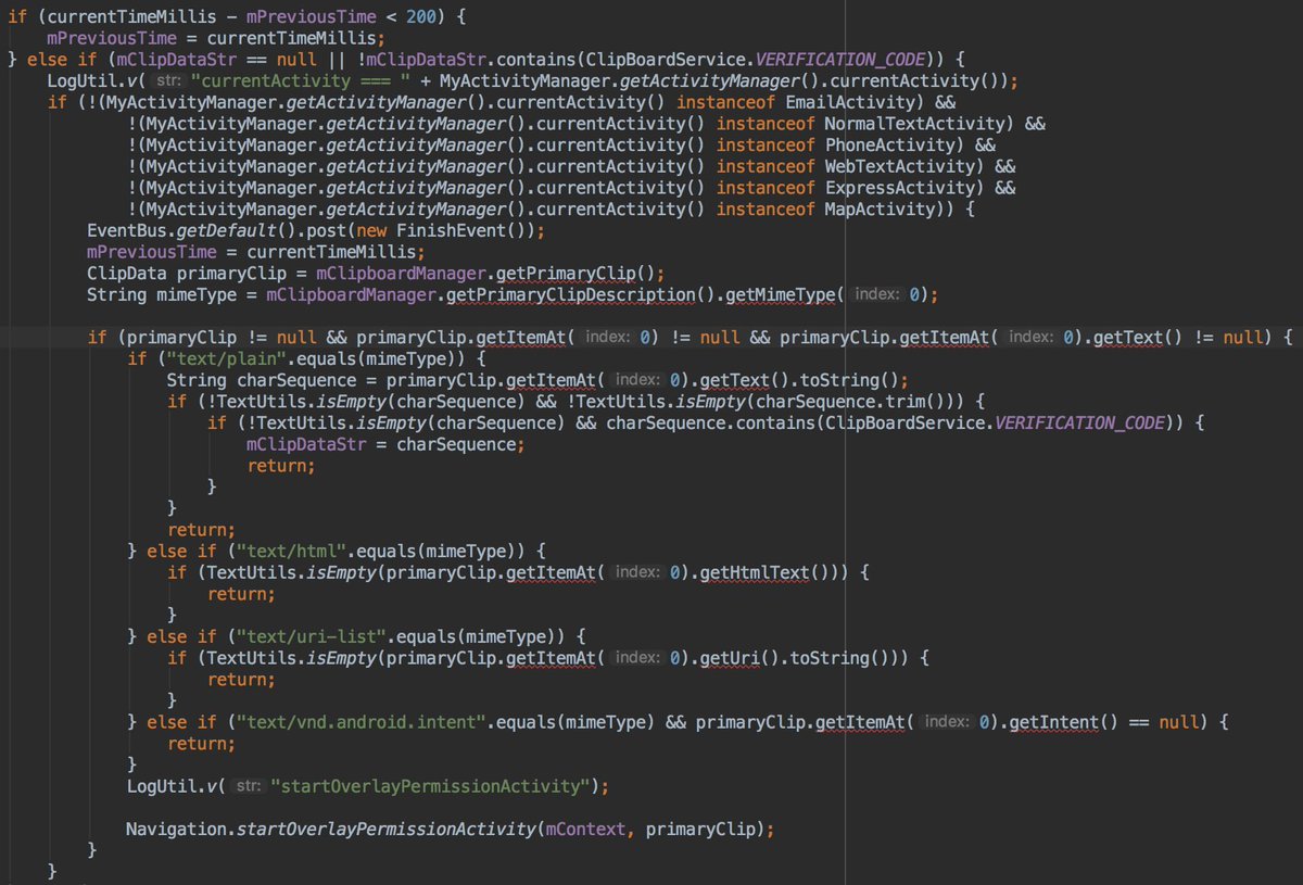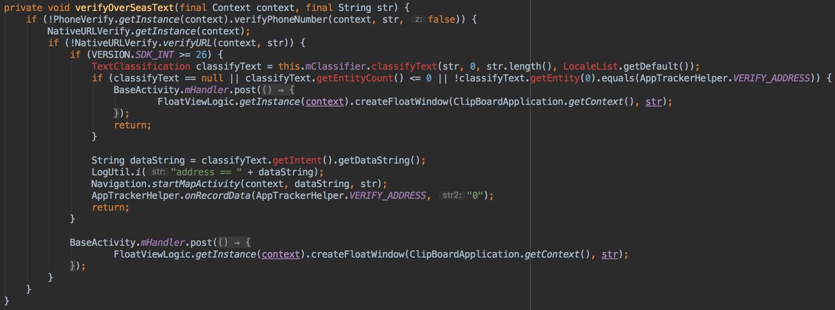 Here the cool stuff: in the startClipBoardManager method they are using multiple interesting methods: - verifyNumberic - verifyMaybeEmail - verifyEmail - verifyOverSeasText - verifyMaybeExpress - verifyTextpic.twitter.com/gPDQ0lraFx