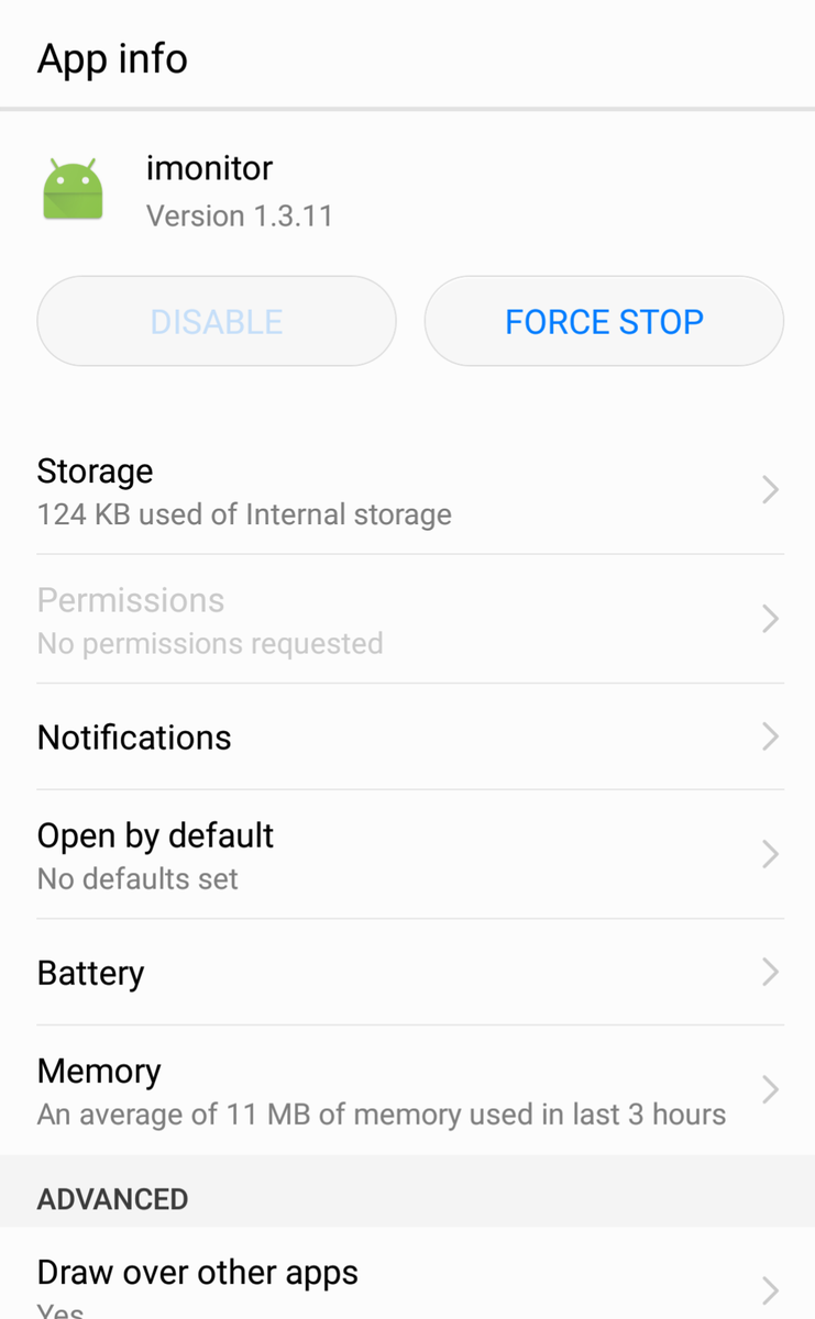 Also, by force- stopping imonitor doesn't stop the data traffic to being sent. The Storage used of Internal Storage is increasing bit by bit from a few kB to MB.