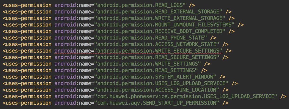 In AndroidManifest.xml, the LogBroadcastReceiver is listening to an action called "com.huawei.lcagent.TCPDUMP". It's worth to say that this receiver is protected by a signatureOrSystem permission. So only a @HuaweiMobile app or a system app can send this action.pic.twitter.com/iXWJGRw0Sm