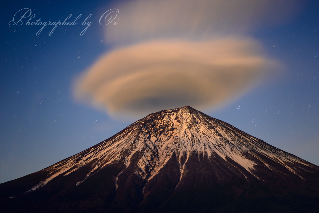 深夜の幻想的な笠雲。 ちょうど月が沈む間際で、富士山と笠雲は月光で赤く染められています。 この夜はかなり長時間、形の良い笠雲が発生して色々な方向へ走り回って必至に撮影をしました。 興奮の一夜でしたね。