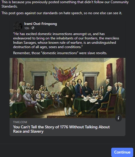 Just got a seven day Facebook ban for quoting the declaration of Independence:pic.twitter.com/pDCvdA3VkK