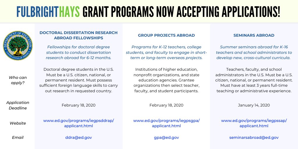 #FulbrightHays Doctoral Dissertation Research Abroad program is now accepting applications through February 18, 2020. Learn more: https://content.govdelivery.com/accounts/USED/bulletins/271b111 …pic.twitter.com/DrrnEHjCu5