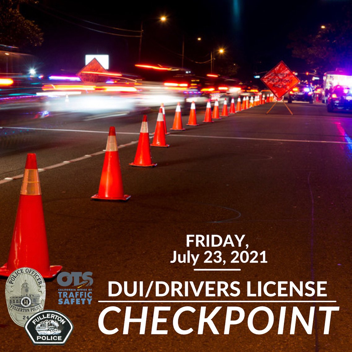 Fullerton PD will be conducting a DUI/Drivers License Checkpoint on Friday, July 23rd. See details below for more info.https://twitter.com/FPDPIO/status/1416044139636924417 …