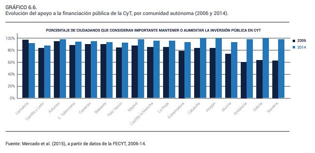 ¿#Sabíasque durante la crisis económica ha aumentado el apoyo a la financiación de la #tecnociencia en todas las comunidades autónomas, con la única excepción de Cantabria –que aun así mantiene un 92% de apoyo– ?
