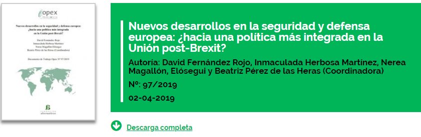 #Documento | Nuevos desarrollos en la #seguridad y #defensa europea: ¿hacia una política más integrada en la Unión post-#Brexit? 📝@davidfrojo, Inmaculada Herbosa, Nerea Magallón y Beatriz Pérez de las Heras (coodinadora). 📥Descarga libre: http://bit.ly/Opex97-2019 pic.twitter.com/wUMmOMBHs5