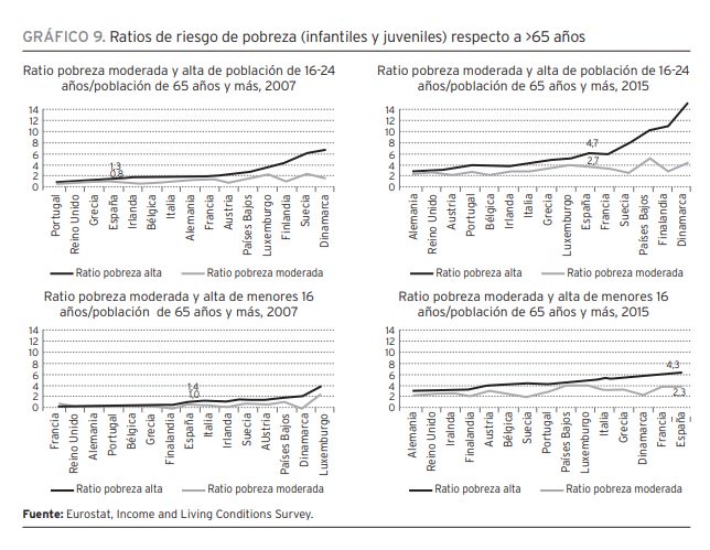 La tasa de #PobrezaInfantil y juvenil duplicaba la de la población de mayor edad en 2015, y la diferencia llegaba incluso a cuadriplicarse en los niveles más severos de pobreza.