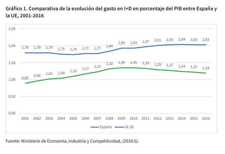 El gasto español en I+D se ha distanciando de la media europea en los últimos años hasta el punto de que, en 2016, el esfuerzo español baja al 58% con respecto al de la #UE.