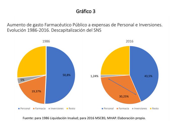 En 2016, el gasto farmacéutico público supuso un 30,25% del Gasto Sanitario Total. El gasto en Personal disminuyó hasta el 43,5% y el gasto en Inversiones al 1,24%.