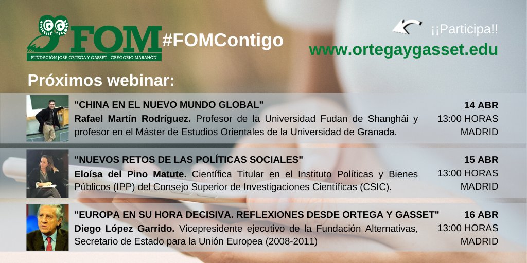 [WEBINAR EN ABIERTO] Participa en nuestra sesiones de los martes, miércoles y jueves, esta semana nos acompañarán en "La hora de la Ortega": Rafael Martín Rodriguez, Eloísa del Pino Matute y Diego López Garrido @DiegoLGarrido.