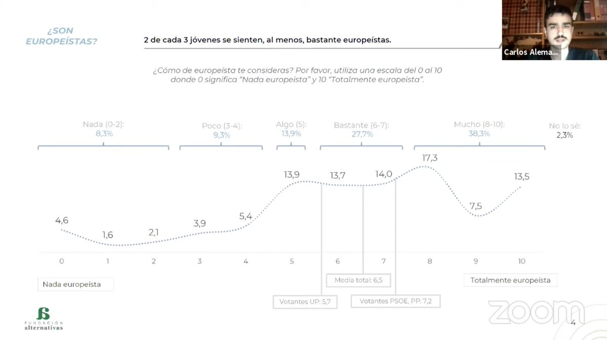 🗣️ Carlos Alemany: "2 de cada 3 jóvenes se sienten, al menos, bastante europeístas. Casi un 66% de los jóvenes españoles se consideran en cierto modo europeístas. Respecto a la gestión de la UE con esta crisis, 1 de cada 4 opina ➡️ El sentimiento 🇪🇺 ha disminuido"pic.twitter.com/Ej2MF5okRO