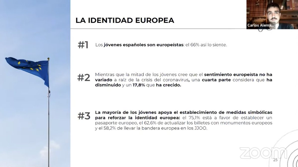 🗣️ Carlos Alemany: "🇪🇺 Los jóvenes españoles son europeístas. 📊La mitad de los jóvenes considera que el sentimiento europeísta no ha disminuido. 👍La mayoría de los jóvenes apoya el establecimiento de medidas simbólicas para reforzar la identidad europea" #JóvenesEspañaUEpic.twitter.com/JaacGZl1kD