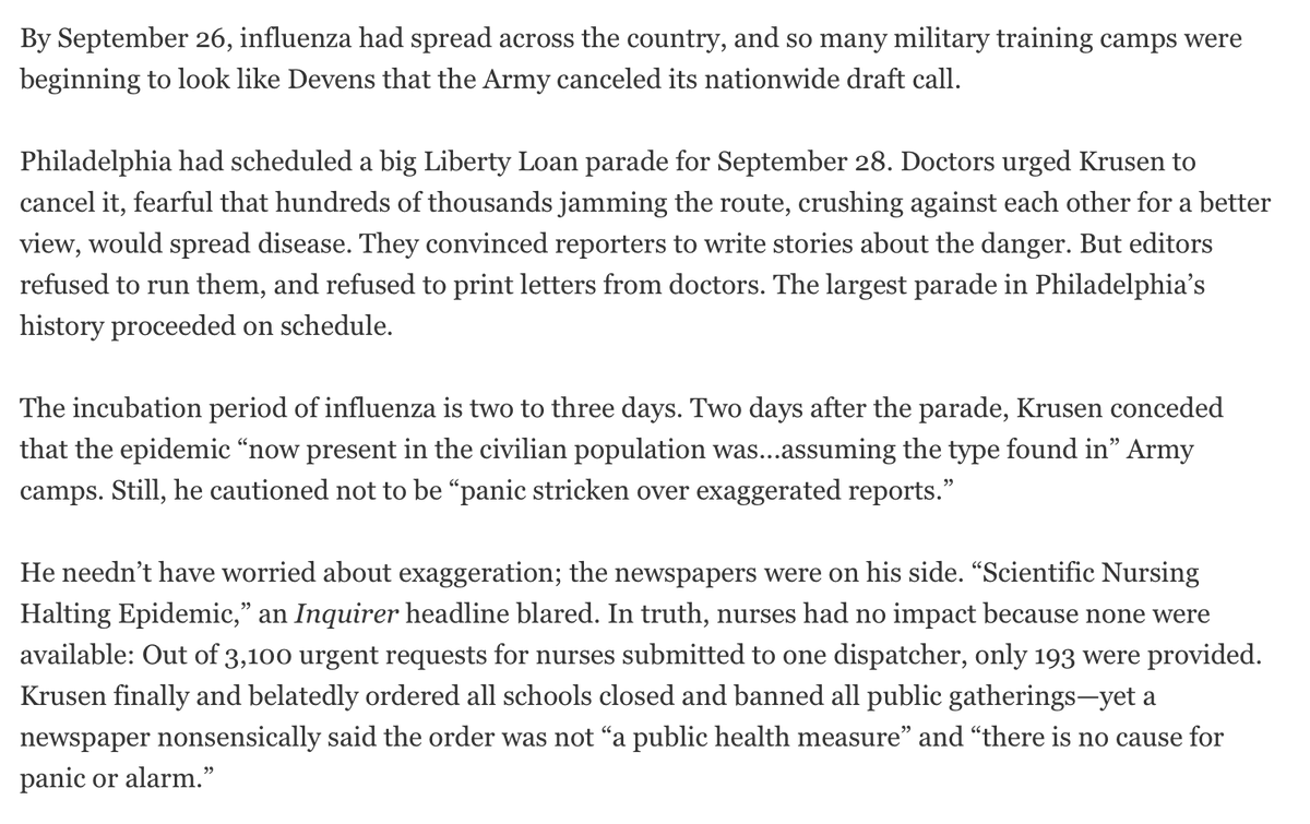 How censorship (in the name of helping morale) gave the Spanish Flu its name. And fueled an outbreak which went on to kill bn 25 and 100mm people. From those liberal/conservative/whatever hacks at Smithsonian magazine: https://www.smithsonianmag.com/history/journal-plague-year-180965222/ …pic.twitter.com/M1SJjXbBvD