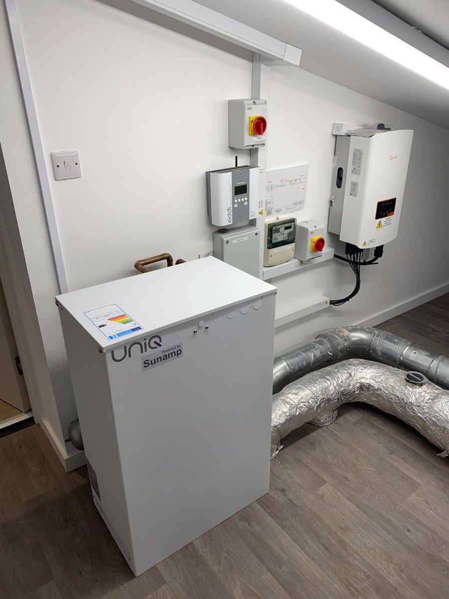 @gbsolpv panels on the roof and a@sunampltd Uniq9 heat battery charged via a@myenergiuk Eddi either from the#solarpv or off peak electricity. All commissioned today. Currently producing 1.1kW in this grey weather, so can still charge the heat battery.pic.twitter.com/E4e5xyf3gF