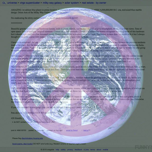 Hilarious! RT @funnyordie: God’s Craigslist post looking for new tenants for Earth: http://bit.ly/1zN9crk #EarthDaypic.twitter.com/Z0seR7Eqpr