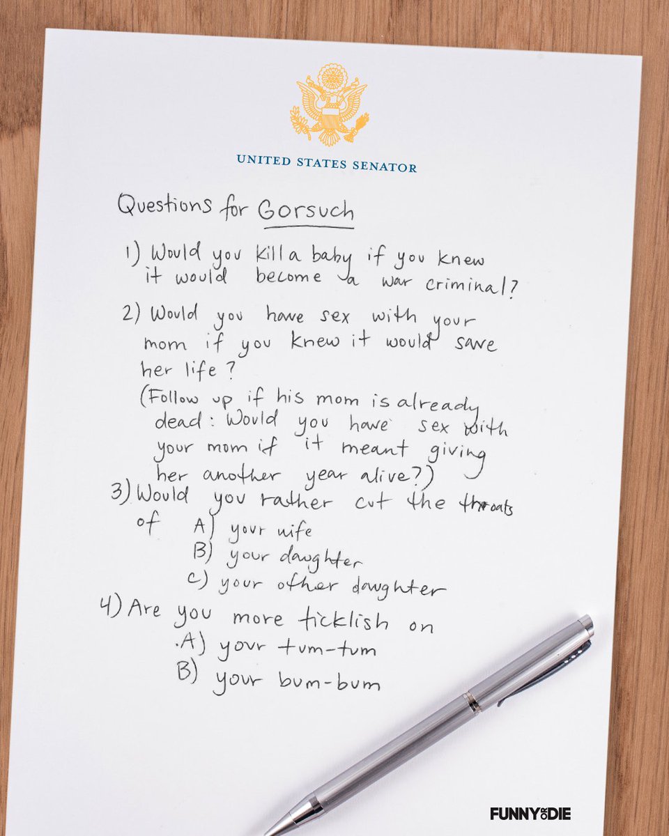 Glad someone was ready to ask Gorsuch the tough questions.pic.twitter.com/9iEaIhSYBF