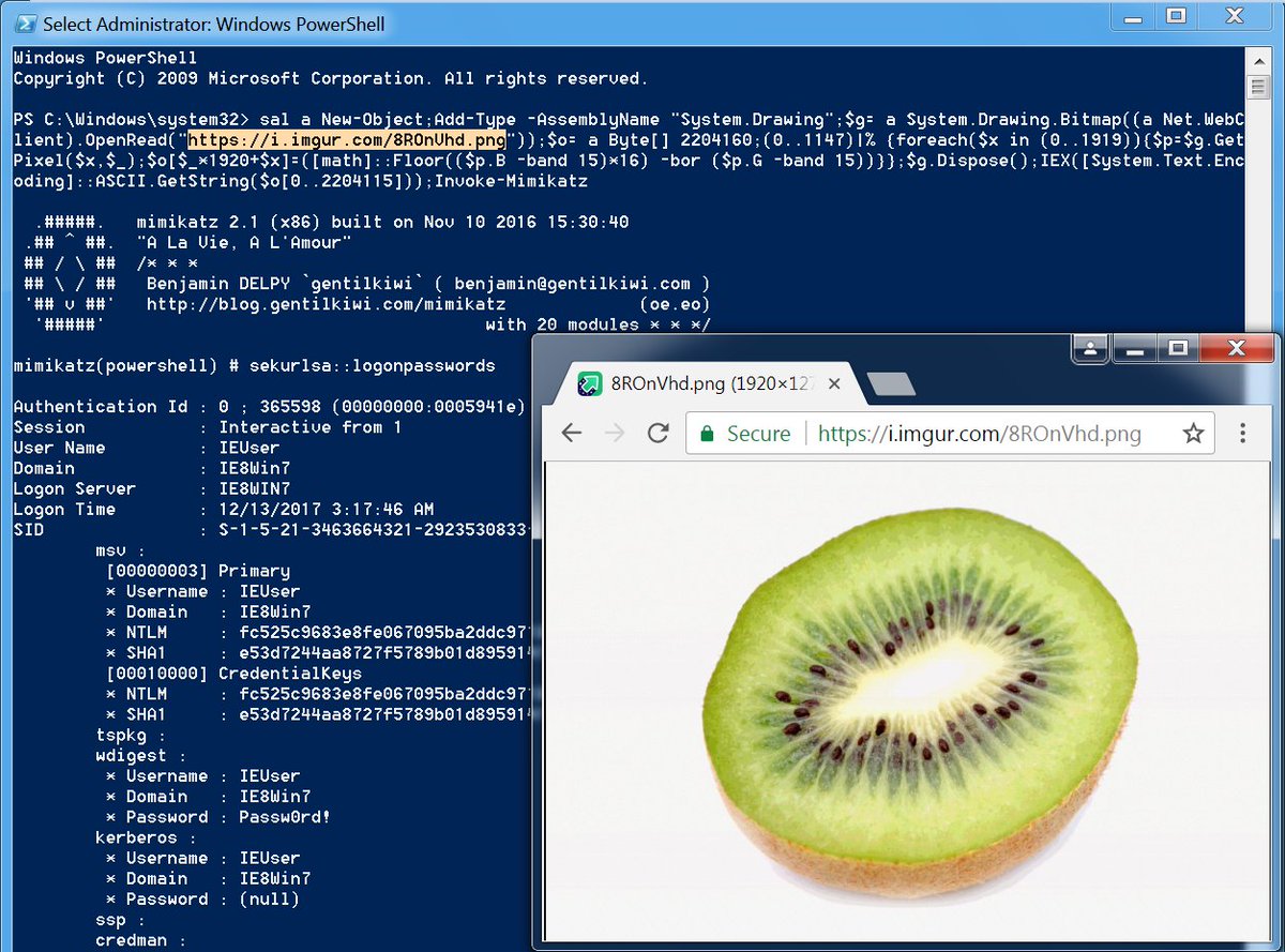 #PowerShell payloads in the pixels of images and generate oneliners to execute with Invoke-PSImage: https://github.com/peewpw/Invoke-PSImage … Is it a kiwi or is it#mimikatz?pic.twitter.com/BE1OpSatvt