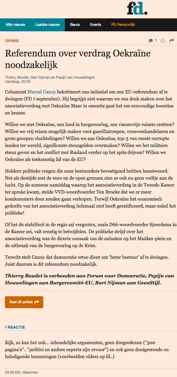 Hierbij de reactie in FD van o.a.@fvdemocratie op de FD column "Haatgevend Referendum" van @marcelcanoy #geenpeilhttps://twitter.com/BartNijman/status/641139161689255936 …