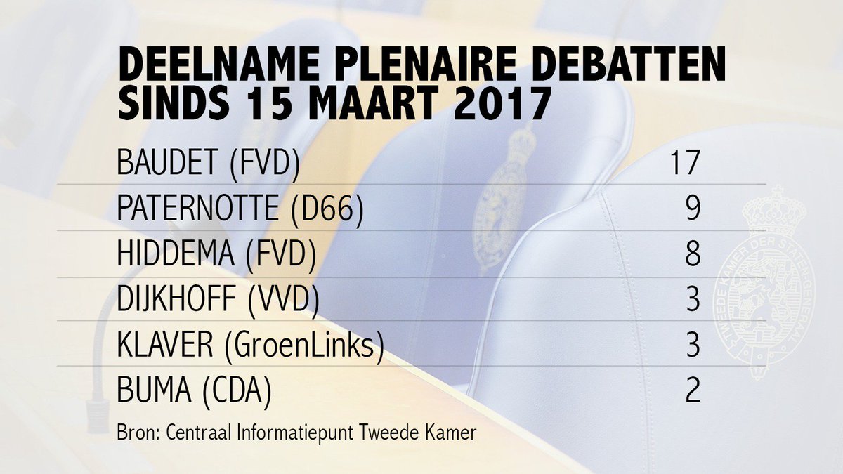 .@jpaternotte (D66) en @sybrandbuma (CDA) beweren dat #FVD vaak afwezig is bij debatten in de Tweede Kamer. Totale onzin! @thierrybaudet sprak bij 17 debatten sinds 15 maart, Jan Paternotte zelf slechts bij 9 debatten. Buma kwam slechts 2 x in actie!pic.twitter.com/792apNhsrP