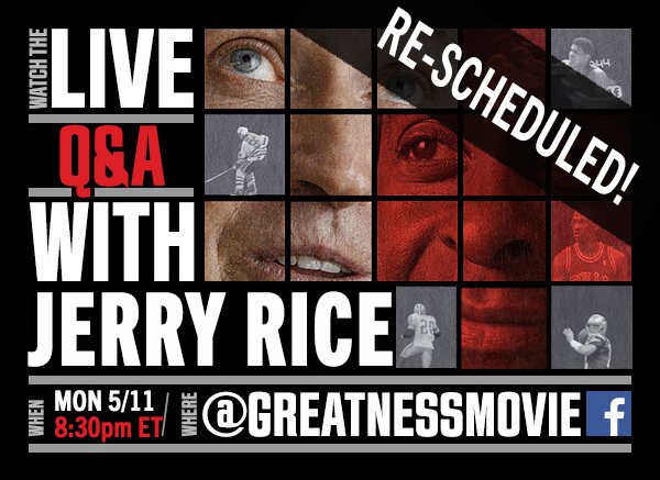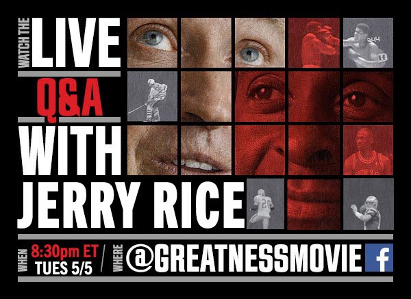 @JerryRice for a special Q&A about @greatnessmovie and much more! It will be fun and interesting. @NFL @49ers#goatspic.twitter.com/tnQRU65UVV