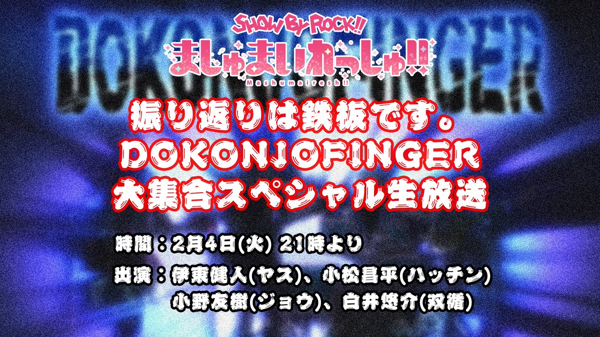 そして明日21時からは「SHOW BY ROCK!!ましゅまいれっしゅ!!」 振り返りは鉄板です。 DOKONJOFINGER大集合スペシャル生放送!! 出演は