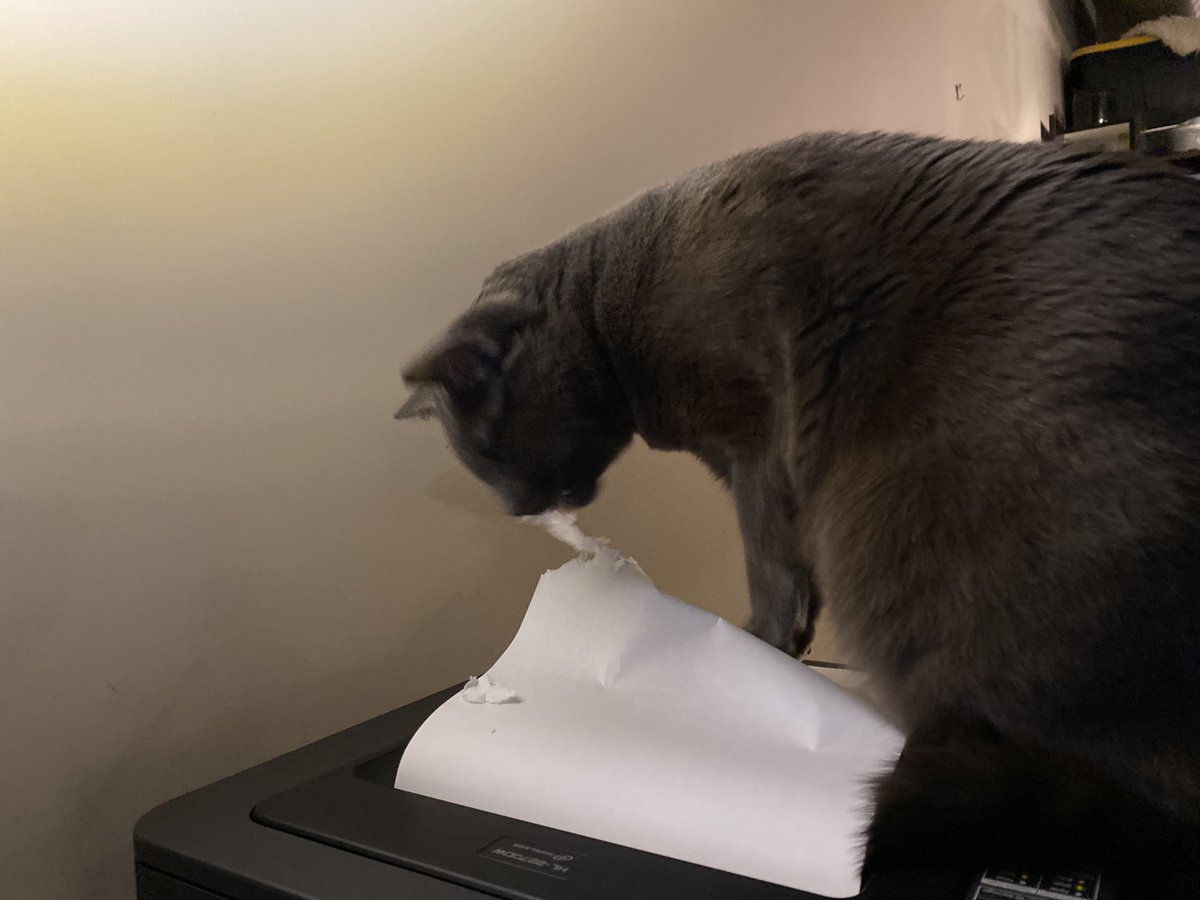 The cat had discovered that it can hit a button and gets a piece of paper to shredpic.twitter.com/JyE3S6uYPC