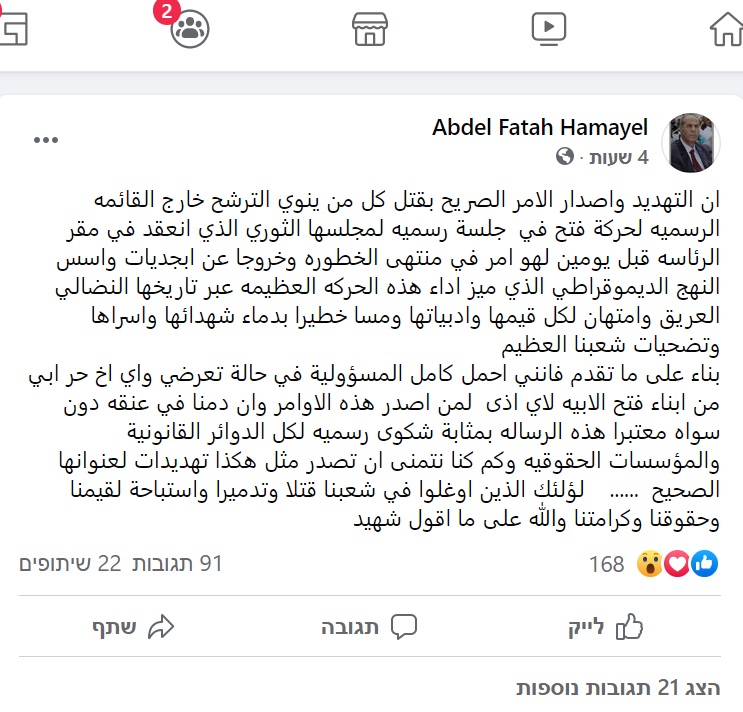פינתוויטר בחירות24: את הסערה התורנית מספק הערב מי שהיה שר, מושל ואיש פת"ח (עדיין) עבד אל-פתאח חמאייל. הוא טוען בפייסבוקו שבישיבת הפת"ח השבוע במוקטעה ברמאללה ניתן איום מפורש לרצוח, כן כן, כל פתחאווי שיתמודד בבחירות שלא ברשימת הפת"ח...