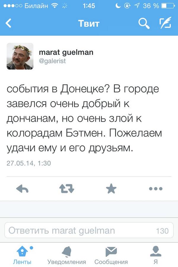 @galerist: события в Донецке? В городе завелся очень добрый к дончанам, но очень злой к вооруженными сепаратистам Бэтмен.