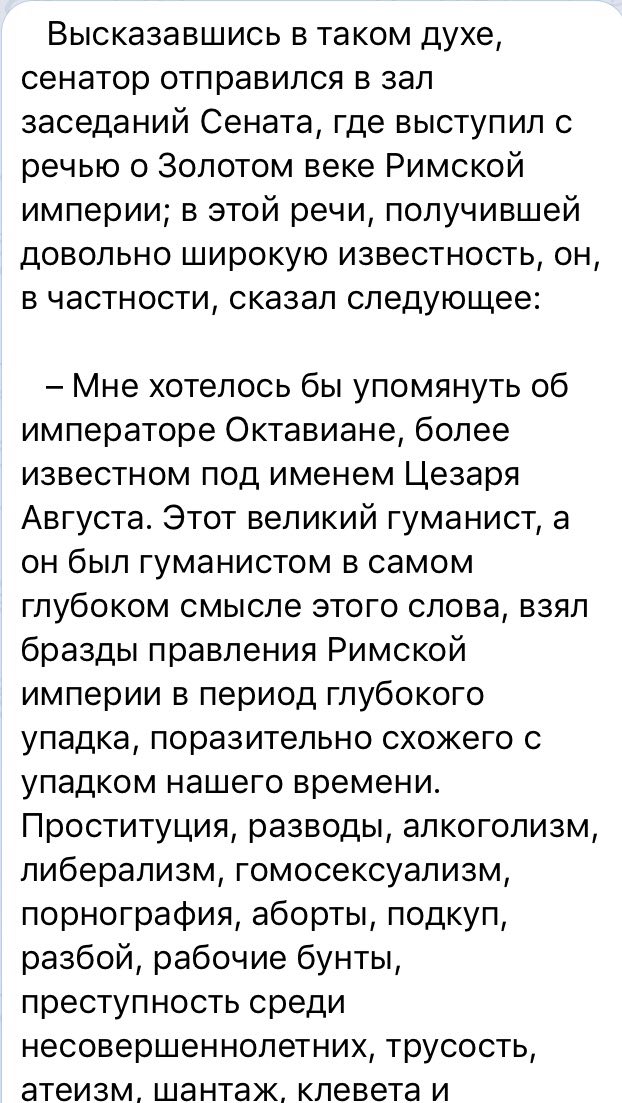 Дорогой мой римский друг Марат. Хочу освежить в твоей памяти произведение моего любимого писателя Курта Воннегута "Дай вам бог здоровья, мистер Розуотер, или Не мечите бисера перед свиньями", 1965 г. Итак, "Золотой век Римской империи"!