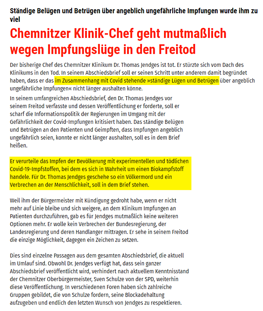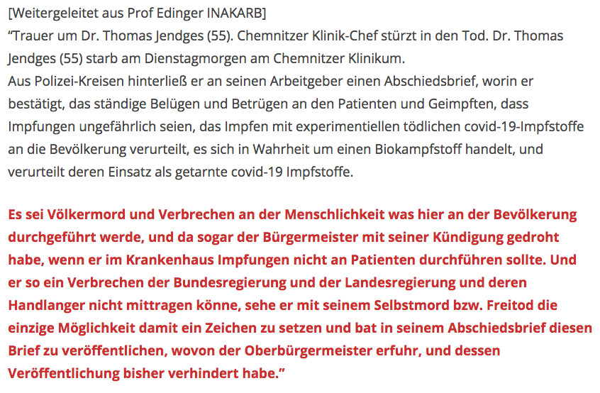 Selbstmord #jendges #Chemnitz - in diesem Text sind keine originalen Passagen aus dem Abschiedsbrief des Klinikchefs - Es sind Paraphrasen aus einem Dritt-Kommentar im gesperrten Nachruf - Neu ist die Information zur Todesart Dachsturz Der Vorfall ist von öffentlichem Interesse.https://twitter.com/Beobach05943803/status/1458902526531706883 …