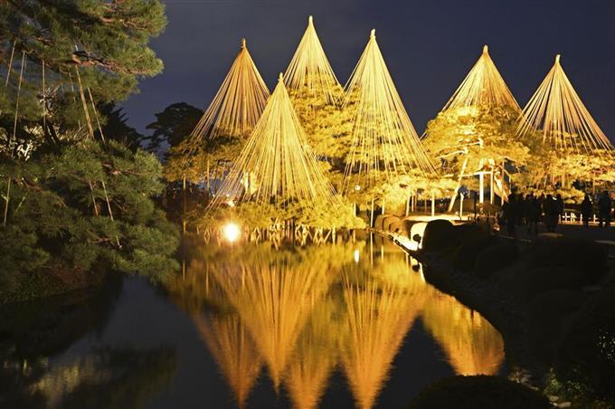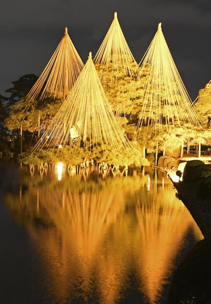 【水面に映える雪づりの松】 日本三名園の一つ金沢市の兼六園で24日、約300基の照明が園内を照らす毎年恒例のライトアップが始まった。今年は暖冬の影響で雪景色とはならなかったが、「雪づり」の松や石灯籠が金色に照らされ池の水面に映える幻想的な光景が広がった。 https://www.sankei.com/photo/story/news/200124/sty2001240015-n1.html …pic.twitter.com/Xg30tt92s5