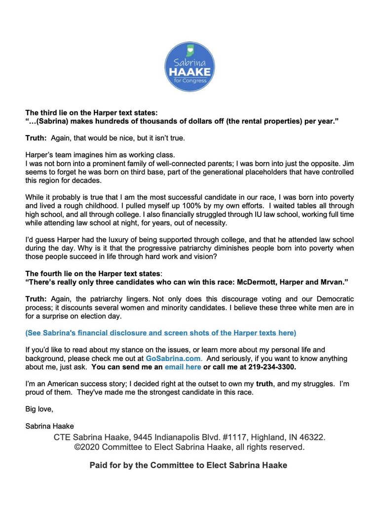 Truth matters. An open letter to NWI voters regarding the Harper Campaign’s misinformation about me: https://sabrinahaakeforcongress.com/misinformation pic.twitter.com/fQNdHPe75o